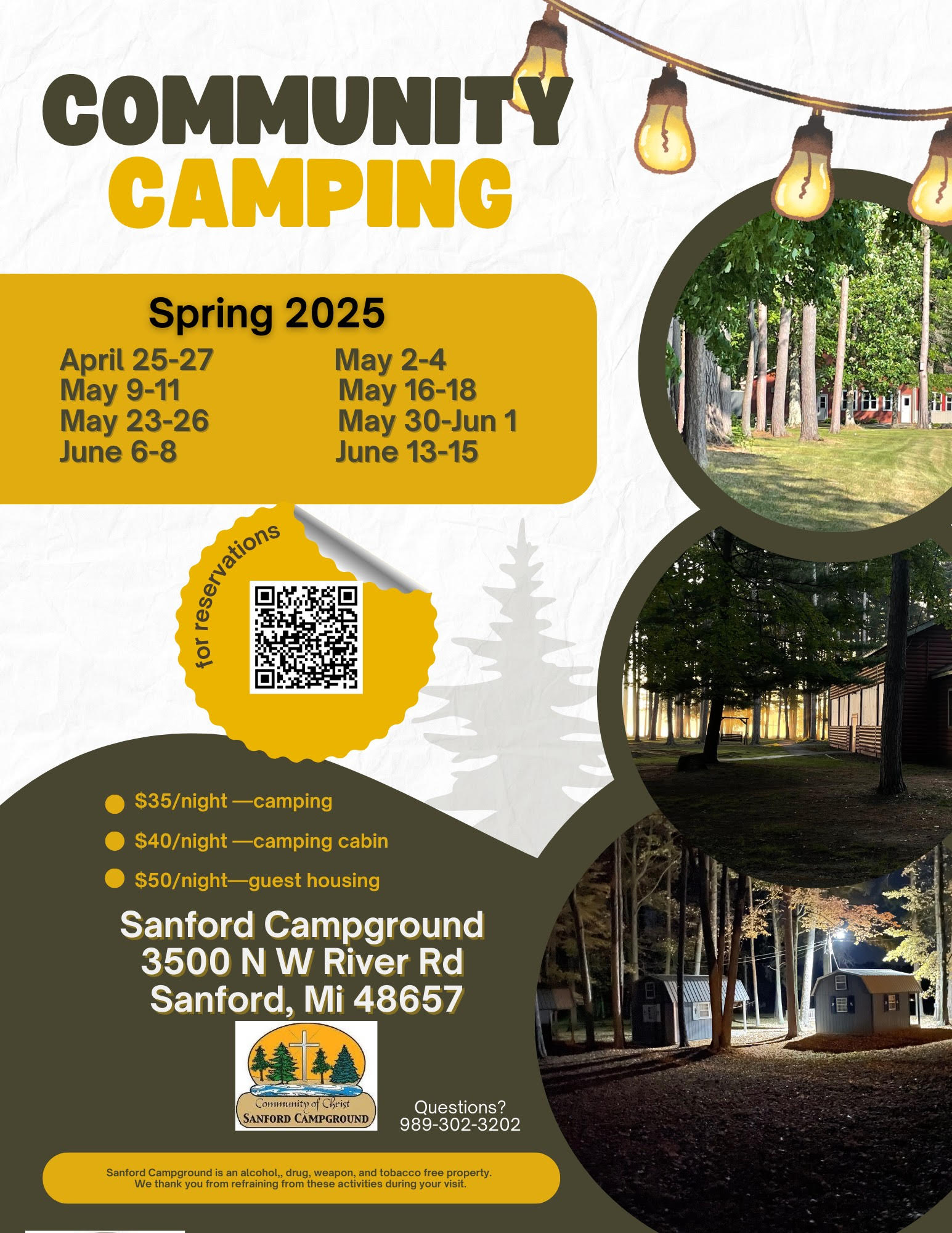 Sanford Campground 3500 N West River Rd, Sanford, MISanford Campground aims to provide places for camping experiences that include fellowship, worship, recreation, and personal development. Our facilities prohibit the use of alcohol, tobacco, marijuana, drugs, weapons, and fireworks. During community camping events only the campsites and bathrooms will be available. All other buildings on the property are off limits and should not be […]
